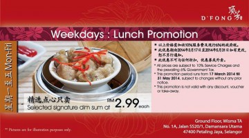 Enjoy selected signature Dim Sums starting from RM2.99. Available from Monday to Friday. Non-halal. Located at Ground Floor, Wisma TA, No 1A, Jalan SS20/1, Damansara Utama, Petaling Jaya, Selangor. Call 03-7725 2918 for enquiries. Address: 1 Jalan SS 20/1, Damansara Kim 47400 Petaling Jaya, Malaysia Opening Hours: 11:30 - 14:30, 17:30 - 23:00 Phone 03-7725 … [Read more...] about SIGNATURE DIM SUM AT RM2.99 AT D’FONG