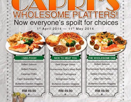 Capricciosa is offering their Capri's Wholesome Platters at RM49.90 each: I See-Food Nice To Meat You The Wholesome One Homemade Lemonade / Mint Spritzer available at RM9.90 per pitcher (usual price:RM19.90). Terms and conditions apply. Visit their restaurant for more details. Available at: Capricciosa - Pavilion Kuala Lumpur Capricciosa - Sunway Pyramid … [Read more...] about CAPRI;S WHOLESOME PLATTERS PROMOTION