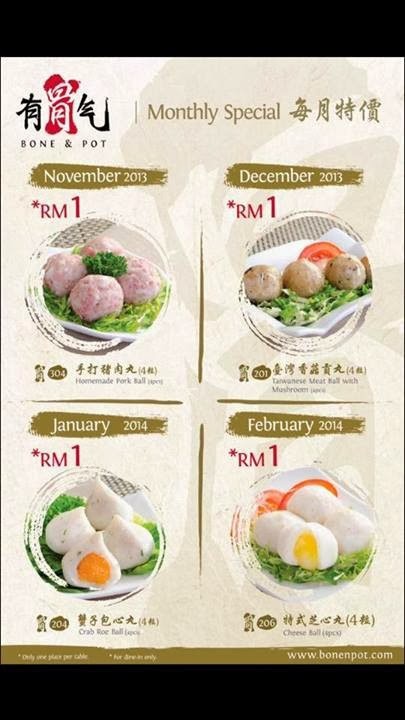 Enjoy special dishes every month for just RM1 at Bone & Pot. Nov 2013 - Homemade Pork Ball Dec 2013 - Taiwanese Meat Ball with Mushroom Jan 2014 - Crab Roe Ball Feb 2014 - Cheese Ball Location: Kelana Jaya Branch No: 7, Jalan SS25/12, 47301 Petaling Jaya, Selangor. Tel +603-7880 5511 Damansara Utama(Uptown)Branch No:88,Jalan SS21/61,Damansara Utama 47400 … [Read more...] about RM 1 PROMOTION AT BONE & POT STEAMBOAT RESTAURANT