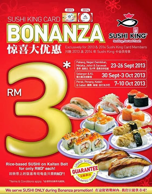 Sushi King would like to show our appreciation to all our loyal customers by guaranteeing unlimited supply of Unagi Sushi. To add more value to RM3 Bonanza Promotion, we'll be serving Pink, Red and Purple plate only throughout the Bonanza Promotion. 23-26 Sept 2013 Pahang, Negeri Sembilan, Melaka, Johor & Sarawak 30 Sept - 3 Oct 2013 Selangor & … [Read more...] about SUSHI KING CARD BONANZA 2013