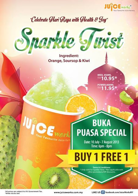 Valid from 10 July -7 August 2013, 6pm-8pm Buy 1 Free 1 Sparkle Twist Blend of Orange, Soursop & Kiwi Terms and conditions: * Only valid for Sparkle Twist * Not applicable with other promotions/VIP discounts … [Read more...] about BUY 1 FREE 1 SPARKLE TWIST AT JUICE WORKS