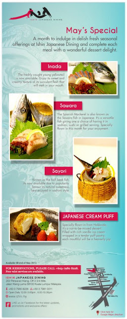 May is here and it's the month to indulge in delish fresh seasonal offerings at Ishin Japanese Dining. We bring you the sweet and succulent Inada, the fresh Sawara, the popular Sayori and the delightful specially flown-in Japanese Cream Puff. View the full menu below & don't forget to make a reservation with us today, +603-7980 8228 ISHIN JAPANESE DINING No. 202, … [Read more...] about MAY SPECIAL AT ISHIN JAPANESE DINING