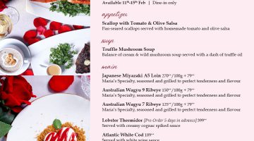 Valentine Day Promotion from 11th February - 15th February. We have a delicious selection of dishes that’s specially prepared for you and your loved one to enjoy. We have our signature steaks, as well as a truly special dessert❤️ that has been made specially for this Occasion. Call now to Book a table/Pre-Order, hurry before all the seats are taken!! KLCC: 0109020386 / … [Read more...] about Valentine Day Promotion @ Maria’s Steakhouse
