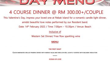 Valentine Magic at Rebak Island! Wine and Dine on our Beach Lawn overlooking the Andaman Sea or at our enchanting Marina Boardwalk accompanied by a cluster of yachts. To create memories with us, please contact 04 966 5566 / 012 545 3892 (Murali) … [Read more...] about Valentine Magic at Rebak Island