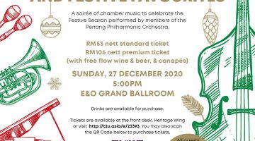 Spend a fabulous evening grooving to Christmas classics and festive favourites perform by the musicians from Penang Philharmonic Orchestra this jolly season! The merry event falls on 27 December, Sunday at the Eastern & Oriental hotel grand ballroom. Purchase your tickets now at http://t2u.asia/23393 … [Read more...] about Christmas Classics & Festive Favourites @ E&O Hotel Penang
