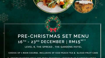 Start off the Christmas spirit early at The Spread Restaurant and appease your palate with these traditional favorites. FOR RESERVATIONS: · call 03-2268 1123 to place your reservations, · Available for dine-in only from 12pm - 3pm (Lunch) and 6pm-10pm (Dinner). … [Read more...] about Pre Christmas Set Menu @ The Gardens Hotel