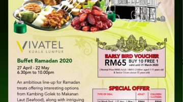 Citarasa Malaysia Ramadan Buffet in Kuala Lumpur Outlets: Garden Terrace Time: 6.30pm to 10.00pm Promotion valid from: From Now to 23 May 2020 Promotion Price (Early Bird): RM 98 nett per person *Coupon purchase from now to 30 March 2020 Normal Price: Adult : RM 128 nett Child : RM 68 nett (Aged 6-12 years old) Senior Citizen : RM 68 nett (Aged above 60 years old) For … [Read more...] about Citarasa Malaysia @ Swiss Garden Hotel Kuala Lumpur