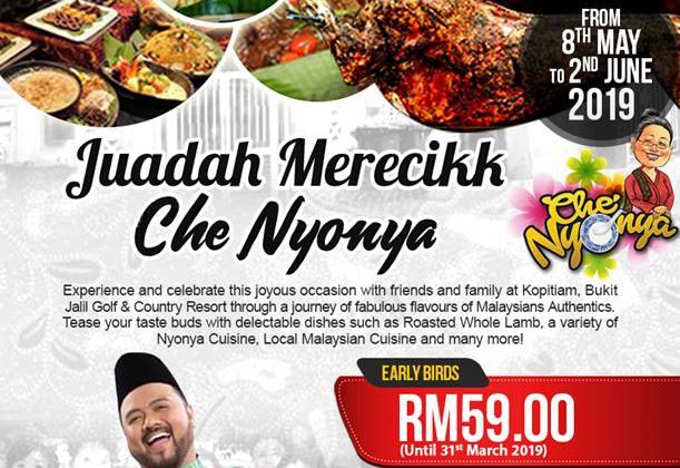 Come and visit us at the “Juadah Merecik Che Nyonya” located at Kopitiam. The buffet starts from 8th May 2019 until 2nd June 2019. They are offering wide range of food after a day of fasting. Be an early bird to grab one of the cheapest buffet in town and enjoy the feast. You can enjoy our lavish buffet at RM 59.00 nett with your family, friends and … [Read more...] about Juadah Merecikk Che Nyonya @ Bukit Jalil Golf & Country Resort