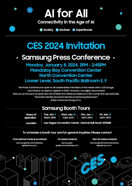 Samsung Electronics will hold a press conference on January 8, a day before exhibitions open for the 2024 Consumer Electronics Show (CES) in Las Vegas, NV. The event is scheduled to begin at 2:00 p.m. local time (5:00 p.m. EST) at the South Pacific Ballroom, North Convention Center, Mandalay Bay Hotel. Jong-Hee (JH) Han, Vice Chairman, CEO and Head of Samsung’s DX … [Read more...] about Samsung Press Conference at CES 2024 ‘AI for All Connectivity in the Age of AI’