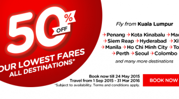 Fly with AirAsia from Kuala Lumpur to selected destinations at 50% off. Enjoy 50% off Business Class too (only available on D7, XJ and XT flights). Booking period from 18th until 24th May 2015 Travel period from 1st September 2015 until 31st March 2016 50% off is applicable to base fares. Promotion is not applicable to PT.Indonesia AirAsia (QZ) domestic … [Read more...] about 50% OFF ON THEIR FARE FOR ALL DESTINATION @ AIR ASIA