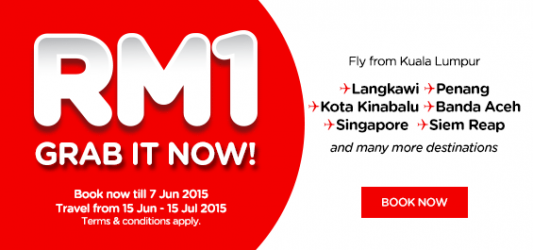 Fly to Langkawi, Penang, Kota Kinabalu, Banda Aceh, Singapore, Siem Reap and many more other destinations from only RM1! Booking is available from now until 7 June 2015. Travel from 15 June – 15 July 2015. Terms and conditions apply, promotional flights are limited and available while it lasts. Terms and Conditions A non-refundable processing fee is applicable for … [Read more...] about RM 1 SALE @ AIR ASIA
