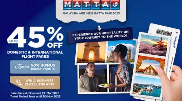 The MATTA Fair may be over, but our Malaysia Airlines MATTA sale is still going strong! It's time to fly like never before with up to 45% off domestic and international flight fares, 50% bonus Enrich Points and 25% off travel add-ons! Indulge your wanderlust as you cruise the skies of Malaysia, Asia and the world, served with our signature Malaysian Hospitality. … [Read more...] about MATTA Fair sale is still on