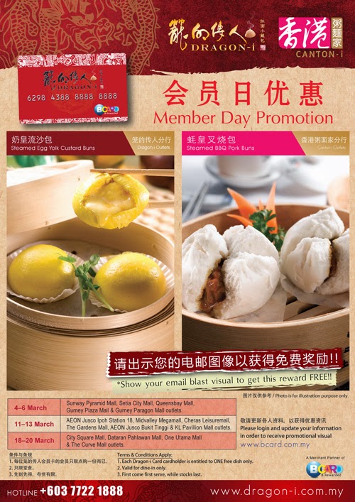 Dragon-i Members get FREE Steamed BBQ Pork Buns at Canton-i City Square JB and 1 Utama outlets. Valid for dine-in only. Show your email blast visual to redeem reward. Terms and conditions apply. Visit their restaurant or website for more details. Call their Hotline at 03-7722 1888 for enquiries. Offer valid for Dragon-i Card Members only. … [Read more...] about DRAGON-I MEMBER PROMOTION