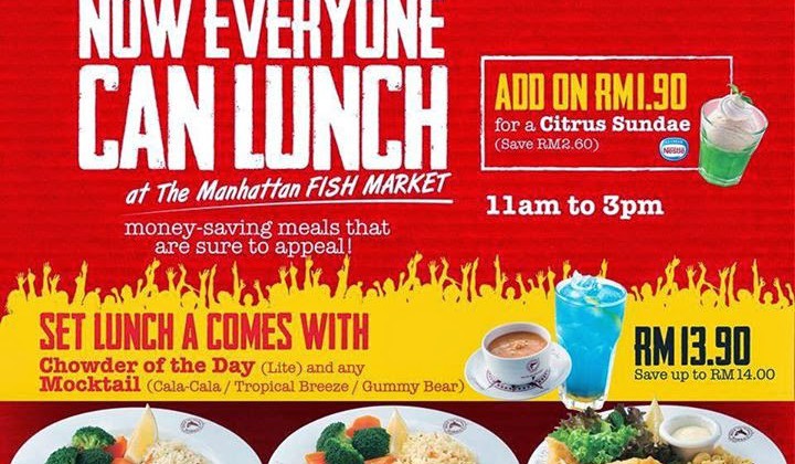 NOW EVERYONE CAN LUNCH!!! With a sea-lections of money-saving meals, you don't have to skimp on lunch anymore! The promotion valid until further notice! Dates : 15 Apr 2014 - 31 Dec 2014 Time : 11:00am - 3:00pm Location : The Manhattan FISH MARKET Storewide … [Read more...] about NOW EVERYONE CAN LUNCH!!! AT THE MANHATTAN FISH MARKET