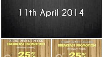 Eight Ounce Coffee is offering 25% off all breakfast items at their: The Gardens Mall outlet from 8.00am until 10.30am Suria KLCC outlet from 7.30am until 10.30am till 11 th April 2014 Terms and conditions apply. Visit their outlet for more details. … [Read more...] about 25% DISCOUNT AT EIGHT OUNCE COFFEE EXTENDED TILL 11 APRIL 2014