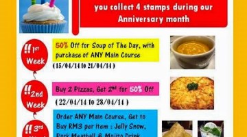For 4 weeks enjoy special promotion at Retro's Kitchen. Date : 15th Apr - 12th May 2014 Week 1 @ 50% Off for soup, when you buy main course Week 2 @ 50% Off on second pizza Week 3 @ RM3 per item, when you buy main course Week 4 @ 50% Off Salad, when you buy main course Do contact Retro Kitchen for reservation and more information. Contact: Jalan SS2/61, 47300 … [Read more...] about 4 WEEKS SPECIAL PROMO AT RETRO KITCHEN