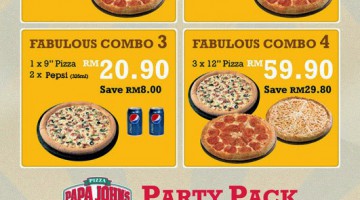 Fabulous Combo 1 (RM29.90) Fabulous Combo 2 (RM39.90) Fabulous Combo 3 (RM20.90) Fabulous Combo 4 (RM59.90) Party Pack (RM91.90) Great Add-On – Chicken Wings (RM7.00) – Potato Wedges (RM3.90) – Onion Rings (RM3.50) Address Ground Floor Lot G 07-08 Berjaya Times Square No.1 Jalan Imbi, 55100 Kuala Lumpur Business Hour Sun – Sat (10am – 10pm) … [Read more...] about FABULOUS COMBOS AT PAPA JOHN’S BERJAYA TIMES SQUARE