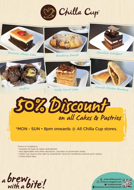 50% DISCOUNT ON ALL CAKES & PASTRIES AT CHILLA CUP May 22, 2013 by StrawberrY Gal 50% Discount on all Cakes & Pastries Time : Mon - Sun @ 8pm onwards Venue : All Chilla Cup stores Promotion starts on 27 May 2013, Monday … [Read more...] about 50% DISCOUNT ON ALL CAKES & PASTRIES AT CHILLA CUP