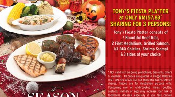 Enjoy the Tony's Fiesta Platter for only RM157.83. Consists of 2 Bountiful Beef Ribs, 2 Filet Medallions, Grilled Salmon, 1/4 BBQ Chicken, Shrimp Scampi and 3 sides of your choice. Terms and conditions apply. Visit their restaurant or website for more details. Available at: Tony Roma's - Citta Mall Tony Roma's - IOI City Mall Tony Roma's - KOMTAR JBCC Tony … [Read more...] about TONY’S FIESTA PLATTER @ TONY ROMA’S
