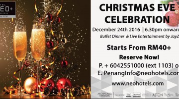Neo's Christmas Eve Dinner 2016 Date: 24th December 2016 Time: 6.30pm onwards RM75+ - Adult RM55+ - Seniors RM40+ - Children Live Performance by Penang's Dynamic Duo - JayZel! Reserve by 20th December 2016 to enjoy a 10% Early Bird Discount! Neo's New Year's Eve Pool Party & Dinner 2016 Date: 31st December 2016 Time: 6.30pm onwards New Year's … [Read more...] about Neo’s Christmas Eve Dinner & New Year’s Eve Pool Party Dinner 2016