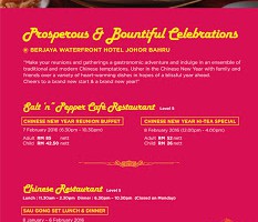 Chinese New Year is just around the corner and in conjunction with this festive celebration, Berjaya Waterfront Hotel Johor Bahru has lined up various food promotions at its outlets to signify a prosperous year ahead. Celebrate Lunar New Year with joy and happiness; enjoy scrumptious buffets or special menus at Salt ‘n’’ Pepper Café Restaurant and Chinese Restaurant, … [Read more...] about CHINESE NEW YEAR PROMOTIONS AT BERJAYA WATERFRONT HOTEL JOHOR BAHRU