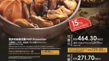Get your voucher now to enjoy 15% discount on the Prosperity Lucky Poon Choy at Elite Grand Ballroom. For 10 pax: Promo price: RM464.30 nett (Original price: RM570.30 nett) With 8-Head Abalone: RM729.30 nett For 5 pax: Promo price: RM271.70 nett (Original price: RM284.10 nett) With 8-Head Abalone: RM374.20 nett PWP Promotion: With purchase of any Poon Choy, … [Read more...] about PROSPERITY POON CHOY @ ELITE GRAND BALLROOM