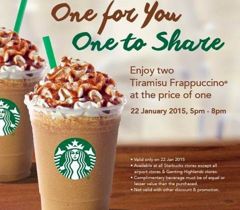 Enjoy Buy 1 Free 1 Starbucks Tiramisu Frappuccino at the price of one tomorrow! Offer valid at ALL Starbucks Coffee outlets nationwide on 22nd January 2015 from 5 pm - 8 pm Terms & Conditions: Valid only on 22 January 2015. Available at all Starbucks stores except all airport stores and Genting Highlands stores. Complimentary beverage must be of equal or lesser … [Read more...] about BUY 1 FREE 1 @ STARBUCKS