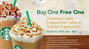 Share the joy this new year! Enjoy Buy 1 Free 1 Starbucks Frappuccino on 15 January 2015 from 5pm to 8pm! Starbucks Buy 1 Free 1 Promotion 2015 (Meet Me at Starbucks): Christmas Cookie Frappuccino / Latte or; Tiramisu Frappuccino Terms & Conditions: * Valid on 15 Jan 2015 only. * Available at ALL Starbucks except airport stores and Genting stores. * Complimentary … [Read more...] about BUY 1 FREE 1 @ STARBUCKS