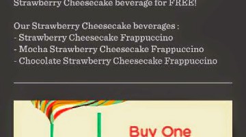 Starbucks Strawberry Cheesecake Beverage Buy 1 Free 1 Strawberry Cheesecake beverages: Strawberry Cheesecake Frappuccino Mocha Strawberry Cheesecake Frappuccino Chocolate Strawberry Cheesecake Frappuccino Promotion period: 14 Jul'14 - 27 Jul'14 … [Read more...] about BUY 1 FREE 1 STARBUCKS STRAWBERRY CHEESECAKE BEVERAGE