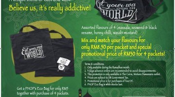 The Paddington House of Pancakes is offering their assorted crackers at RM8.50 per packet or 4 packets for RM30.00. 4 flavours available (massala, seaweed & black sesame, honey chili and wasabi mustard). Buy a PHOP's Eco Bag for RM5.00 only with purchase of 4 packets. Only available during the Ramadhan month. (From 28 Jun 2014 (Sat) - 27 Jul 2014 (Sun)) 3 days … [Read more...] about RAMADHAN ASSORTED CRACKERS FROM PADDINGTON HOUSE OF PANCAKES