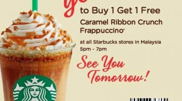Starbucks Buy 1 Get 1 Free Caramel Ribbon Crunch Frappuccino at all Starbucks Stores in Malaysia from 5pm – 7pm tomorrow, 21st May 2014 Redeem this promo by getting the barcode scanned at any Starbucks stores in Malaysia during the redemption period Terms and Conditions Redemption hour: 21 May 2014, 5pm – 7pm Maximum one voucher per redemption A valid priviledge code … [Read more...] about SAY YES TO BUY 1 FREE 1 CARAMEL RIBBON CRUNCH FRAPPUCCINO IN STARBUCKS