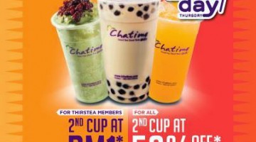 Chatime is offering: For Thirstea Members - Present your Thirstea Card upon order and get a 2nd drink at RM1 For non-members - 50% off on your 2nd drink with any purchase Valid from 3pm until 6pm. Not valid at Chatime Gurney Plaza and Queensbay Mall. Terms and conditions apply. Visit their website for … [Read more...] about THIRST-DAY PROMOTION AT CHATIME
