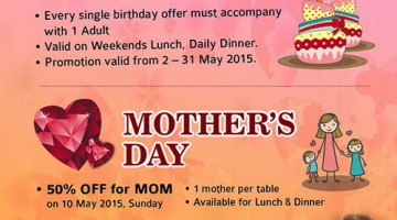 Tao Authentic Asian Cuisine is offering: 50% off for May birthday (2nd until 31st May 2015) - Every single birthday offer must be accompanied by 1 adult - Valid on weekends lunch and daily dinner 50% off for mom on Mother's Day (10th May 2015) - 1 mother per table - Available for lunch and dinner Terms and conditions apply. Visit their restaurant or website … [Read more...] about MOTHER’S DAY PROMOTION @ TAO AUTHENTIC ASIAN CUISINE