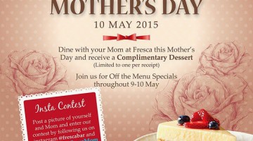 Dine with your Mom at Fresca Mexican Kitchen & Bar on Mother's Day and get a complimentary Dessert (limited to 1 per receipt). Join them for Off the Menu Specials on 9th and 10th May 2015. Terms and conditions apply. Call 03-2201 2893 for enquiries. Available/spotted at: Fresca Mexican Kitchen & Bar - avenue K Fresca Mexican Kitchen & Bar - The Gardens … [Read more...] about MOTHER’S DAY PROMOTION @ FRESCA MEXICAN KITCHEN