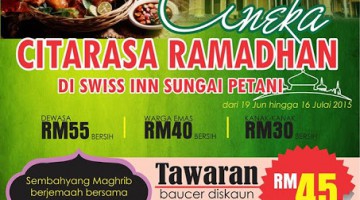 Rekindle this meaningful holy month with friendship and your loved ones in our cozy “Kampung Style” ambiance. Early Bird offer of RM45 NETT from now to 18 June. For more details, please call +609 544 7333 ext. 1029/2014 or log on to http://bit.ly/Ramadhan_SungaiPetani for online reservation. #Ramadhan #SwissInn #SungaiPetani ADDRESS: Swiss Inn Sungai … [Read more...] about ANEKA CITARASA RAMADHAN @ SWISS INN SUNGEI PETANI