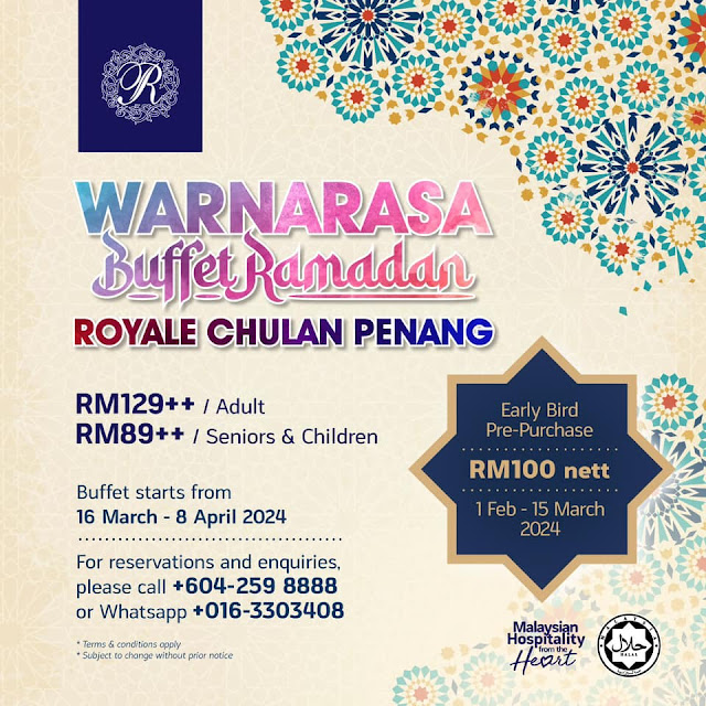 Enjoy a well-deserved buka puasa meal with your family and friends at Royale Chulan Penang this holy month of Ramadan! Call them at 04 259 8888 or WhatsApp to 016 330 3408 to booking 𝟏𝟔 𝐌𝐚𝐫𝐜𝐡 - 𝟖 𝐀𝐩𝐫𝐢𝐥 𝟐𝟎𝟐𝟒 𝐑𝐌𝟏𝟐𝟗++ 𝐀𝐝𝐮𝐥𝐭 𝐑𝐌𝟖𝟗++ 𝐒𝐞𝐧𝐢𝐨𝐫 𝐂𝐢𝐭𝐢𝐳𝐞𝐧 / 𝐂𝐡𝐢𝐥𝐝𝐫𝐞𝐧 #RoyaleChulanPenang #WarnaRasa #Iftar #Ramadan #RamadanBuffet #Penang #PenangHotels #tawaranistimewa … [Read more...] about Warnarasa Buffet Ramadan @ Royale Chulan Penang