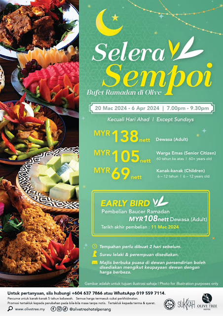 𝗦𝗲𝗹𝗲𝗿𝗮 𝗦𝗲𝗺𝗽𝗼𝗶 𝗕𝘂𝗳f𝗲𝘁 𝗥𝗮𝗺𝗮𝗱𝗮𝗻 📍15 March 2024 - 7 April 2024 ⏰ 6.30p.m. – 9.30p.m. 💸Price : RM 138 nett (Adult 👨👩) RM 105 nett (Senior Citizen👴👵) RM 69 nett (Child👦👱) More Info: 📌 𝗢𝗹𝗶𝘃𝗲 𝗧𝗿𝗲𝗲 𝗛𝗼𝘁𝗲𝗹 𝗣𝗲𝗻𝗮𝗻𝗴 📫 Address : 76, Jalan Mahsuri, 11950 Bayan Lepas, Pulau Pinang 📞 Tel : 04 - 637 7777 📎 Laman web : … [Read more...] about Ramadhan Buffet 2024: Selera Sempoi @ Olive Tree Hotel Penang