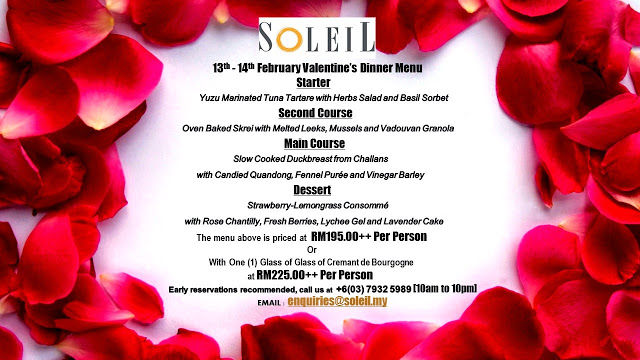 Restaurant Soleil, Ground floor , 22A, Jalan 17/54, Seksyen 17, 46400 Petaling Jaya, Selangor D.E Tel: + 603 7932 5989 Fax: +603 7932 0877 … [Read more...] about VALENTINE’S DINNER MENU AT SOLEIL, SECTION 17