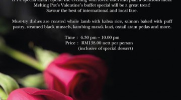 Love is in the air. Celebrate this special occasion with loved ones on February 14, 2017 with amazing buffet spread at Melting Pot Café. Treat your loved ones to a truly romantic dinner. In conjuction with Valentine’s day, the culinary team has whipped up a feast fit for lovers with choices aplenty for all to savour. Get ready to be spoiled to for choice with international … [Read more...] about (Valentine 2017) A taste of Love in Melting Pot