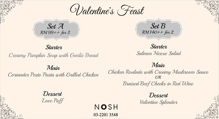 Planning for a romantic Valentine's Day dinner? We've got just what you need! For reservations: 03-2201 3548 View all Valentine's specials: http://bit.ly/NOSH_FebPromo Nosh No. 7 Jalan Telawi 3, Bangsar Baru, 59100 Kuala Lumpur. Tel : +603 2201 3548 [email protected] … [Read more...] about VALENTINE FEAST IN NOSH!