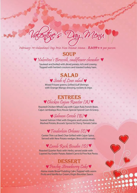 2014 Valentine's day dinner set at Coffee Chemistry Signature (6pm - 10.30pm) at RM 65+ per pax Call 03-5612 2299 for reservation FREE 'Bring Your Own Wine' (Prior reservation required) Soup: Veloute of Fresh Broccoli & Leek Stew with Almond flakes & Fresh cream Mains: Roulade of chicken ‘ala ’ king, stuffed with Salmon mousse on Mashed Potatoes and … [Read more...] about VALENTINE DAY SET AT COFFEE CHEMISTRY SIGNATURE